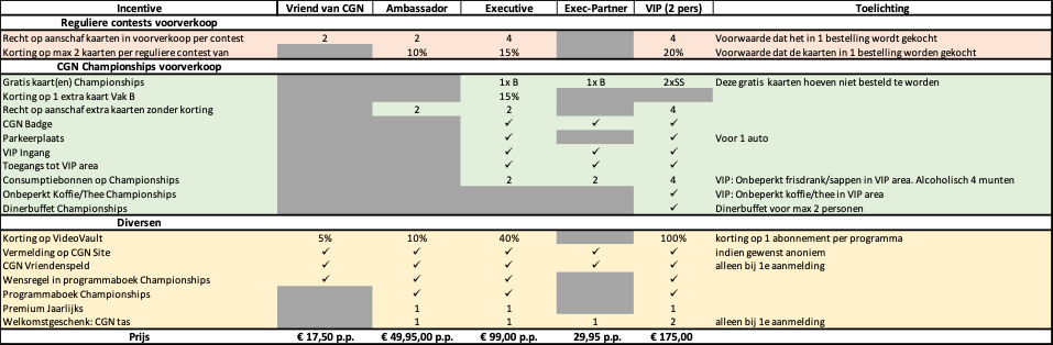 Je kan kiezen uit een Friend, Ambassador, Executive of VIP pakket. In de afbeelding hieronder zie je per rol welke extra's je krijgt.